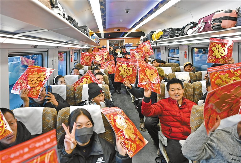 图3:过年返乡的乘客展示福字。