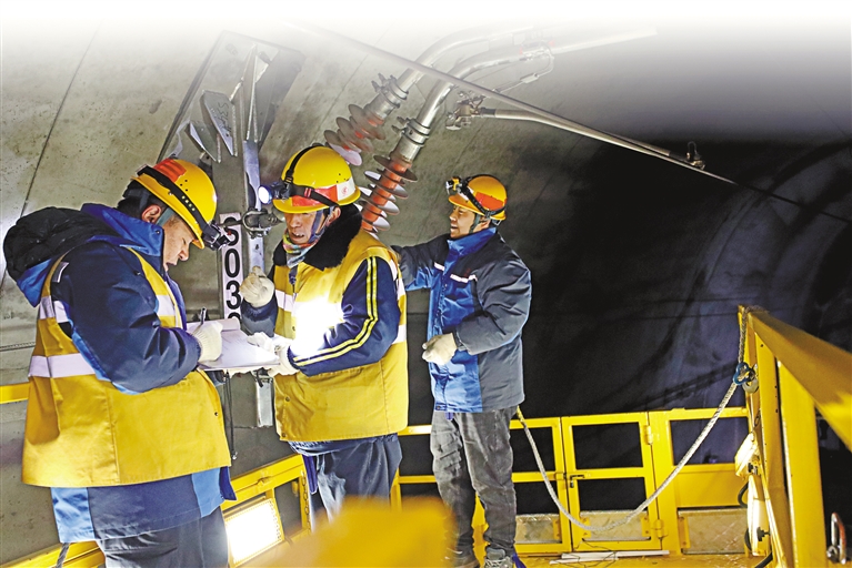 图2:为保障春运安全,中国铁路青藏集团公司拉萨基础设施段拉萨南接触网维修队正在对白堆站至协荣站区间的接触网设备进行重点检修。