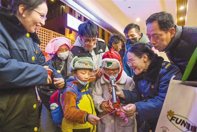 图5:春运首日,拉萨火车站候车大厅开展新春猜谜活动,为参与活动的旅客送上新年伴手礼。