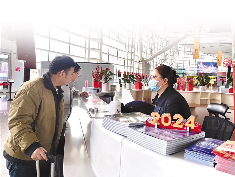 图7:旅客正在拉萨贡嘎机场咨询台咨询航班信息。