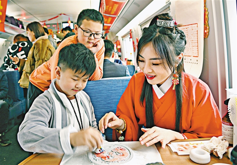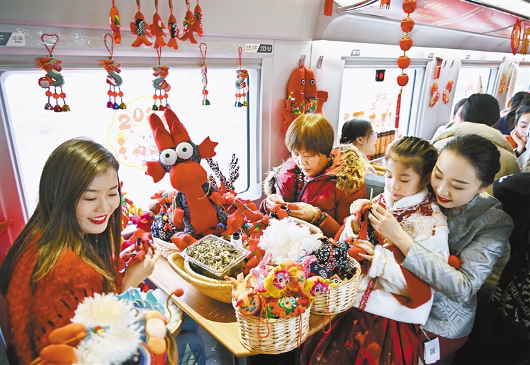 1月30日,中国铁路济南局集团有限公司青岛客运段在齐鲁环游线G6955次列车上开展“年俗非遗进高铁”活动,让旅客在旅途中感受传统文化的魅力,营造浓郁的节日氛围。
