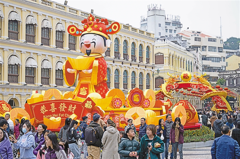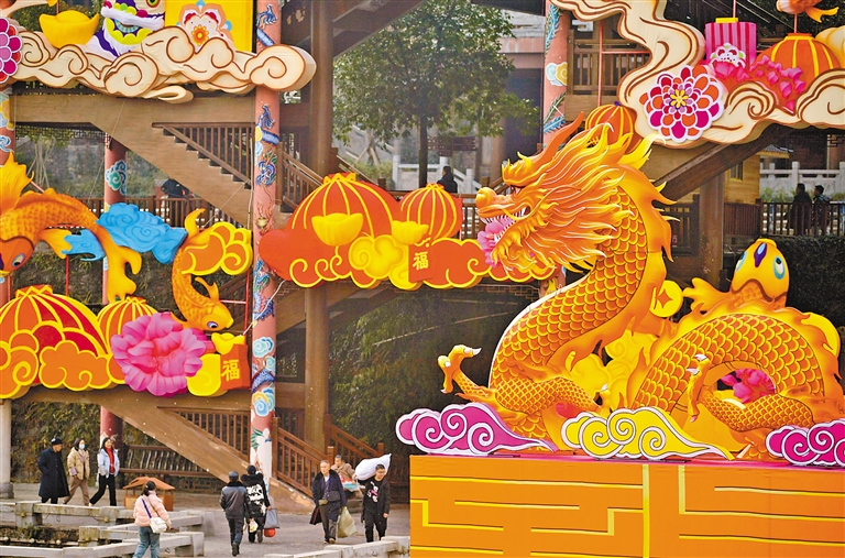 1月29日拍摄的湖北省宣恩县贡水河畔的迎新春景观造型(1月29日摄)。新华社发(宋文 摄)