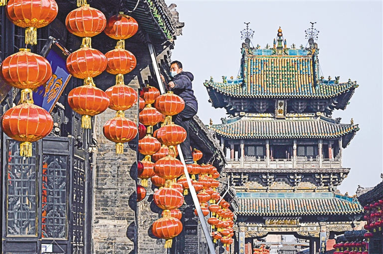 1月29日,工人在山西省晋中市平遥古城悬挂大红灯笼。
