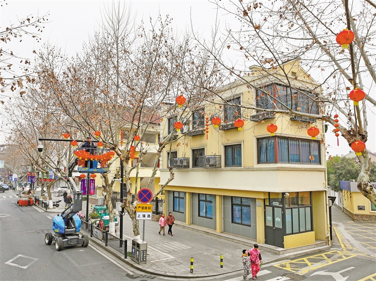 1月29日,工人在浙江省湖州市吴兴区埭溪镇挂灯笼(无人机照片)。新华社发(何伟卫 摄)