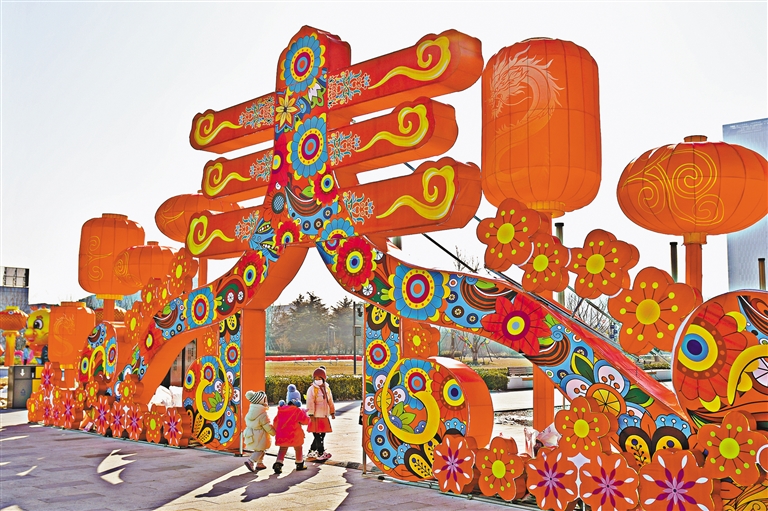 1月28日,孩子们在山东省烟台市黄渤海新区一处休闲广场观赏花灯。新华社发(孙文潭 摄)