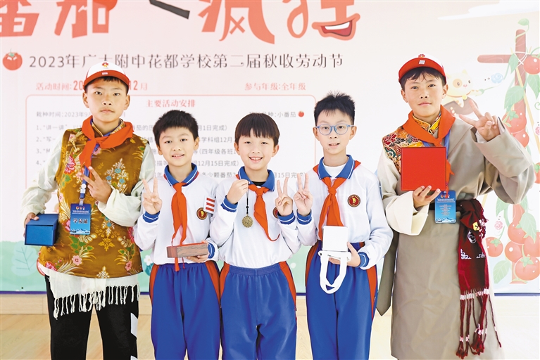 下图:参加冬令营活动的少先队员与广大附中花都实验学校的新朋友互换礼物并合影。 本报记者 谢筱纯 王珊 摄