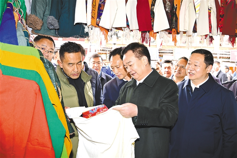 王君正与游客亲切交谈,并祝他们在拉萨玩得开心愉快。“生意好不好?每个月多少收入?”王君正随机走访沿街商户,向销售人员、购物群众询问商品价格、市场需求等情况,了解到店铺每日收入3000余元时,王君正叮嘱商户抓住市场机遇,灵活经营、做大销量,并祝愿他们在新的一年生意兴隆、生活幸福。