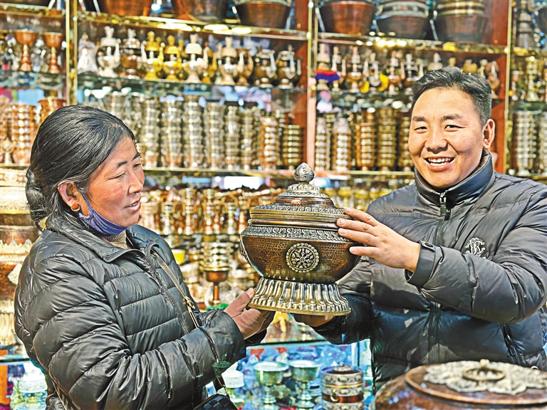 新年前夕,切玛盒摊位的生意特别好。“今年买了新房,想购买一个新的切玛盒,母亲喜欢纯色,我们年轻人喜欢彩绘的,不过价格都特别实惠,我们再商量商量。”市民次仁雍措乐呵呵地说道。