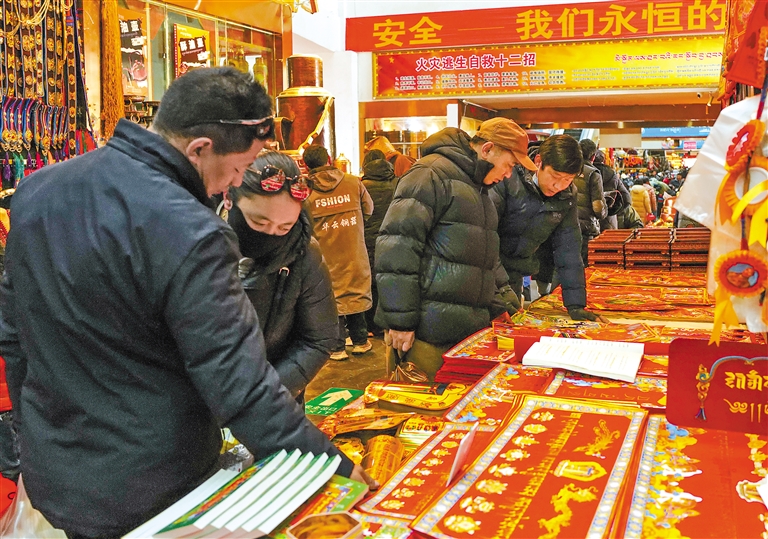 春节、藏历新年将至,拉萨市区各大商超、冲赛康市场、八廓商城人头攒动、热闹非凡,采购年货的市民群众络绎不绝,商贩们的吆喝声此起彼伏,到处都洋溢着欢乐喜庆的氛围。