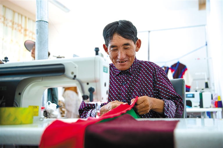 阿里地区革吉县布贡村农牧民合作社的一位村民在缝制藏袍。新华社发(旦增努布 摄)
