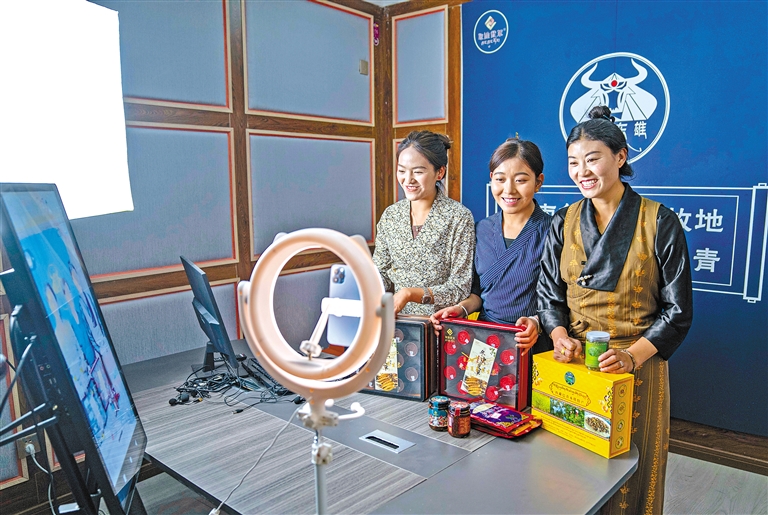 网络主播在那曲市巴青县“赤堆东雄”网红直播间推介当地特色农牧产品。新华社记者 孙非 摄