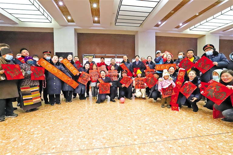 春运期间,我区交通运输各部门进一步优化工作流程,做好各项保障措施,用心服务温暖旅客返乡路。 图为拉萨火车站工作人员和旅客们拿着福字、春联等合影。 本报记者 丹增群培 本报通讯员 次仁德吉 摄