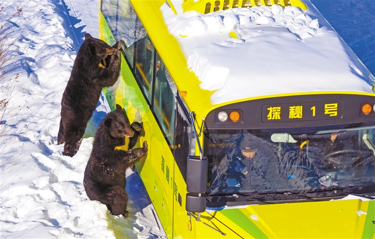 ?1月25日,在“中国东极”黑龙江省抚远市的黑瞎子岛探秘野熊园,黑熊与体验生态穿越项目的游客互动(无人机照片)。新华社记者 才扬 摄