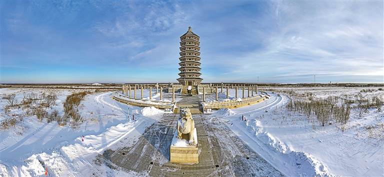 ▲1月25日在“中国东极”黑龙江省抚远市拍摄的黑瞎子岛旅游区内的东极宝塔(无人机全景照片)。