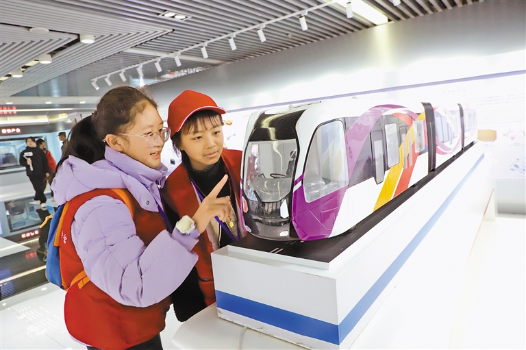 图为山南、湘潭两地学生在中车株洲所参观智轨列车(无人驾驶公交电车)模型。