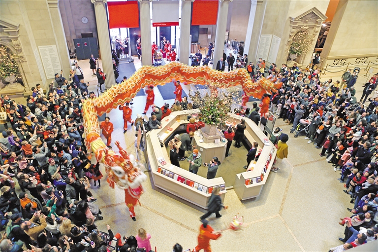 伴着欢腾的锣鼓声,一条金红相间的中国龙在美国最大的艺术博物馆——纽约大都会艺术博物馆大厅内穿行。精彩的舞龙表演3日正式开启大都会艺术博物馆2024“喜迎龙年·欢乐春节”庆祝活动。