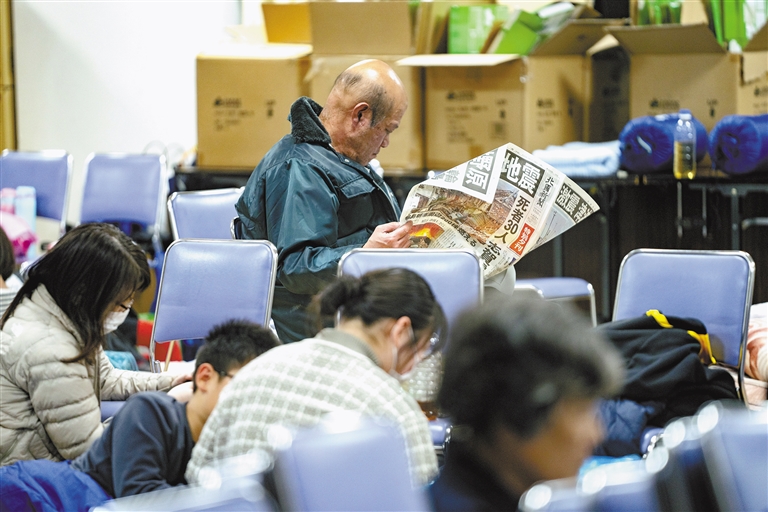 图为1月2日,人们在日本石川县志贺町一处小学内避难。 新华社记者 张笑宇 摄