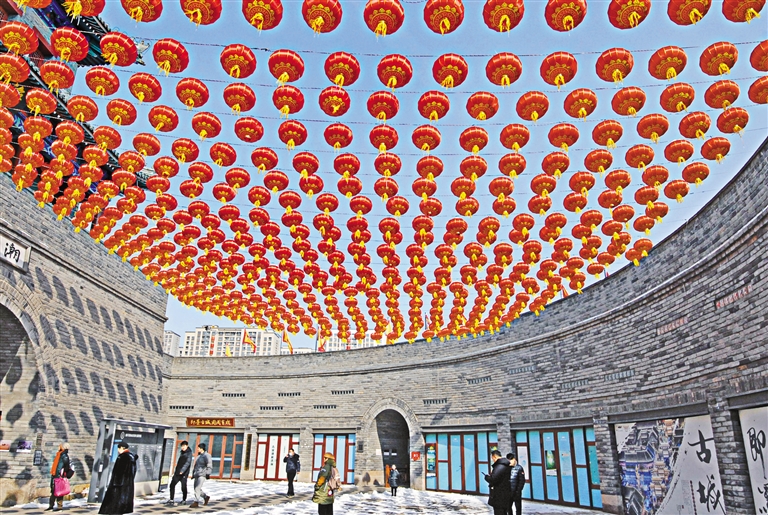 山东:2月6日,游客在山东省青岛市即墨古城大红灯笼下观赏游玩。新华社发(张涛 摄)