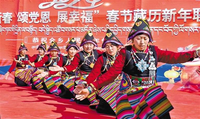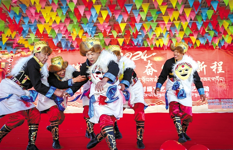 图为山南市曲松县2024年“龙腾迎新年 奋发启新程”暨“大地欢歌四季村晚”现场,村民变身大“民”星,表演精彩节目。 本报记者 丹增平措 摄
