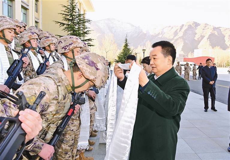 二月六日上午,自治区党委书记、西藏军区党委第一书记王君正看望慰问驻藏部队、武警官兵。这是王君正为驻藏某部官兵献上洁白的哈达,送上真挚的祝福。本报记者 旦增西旦 摄