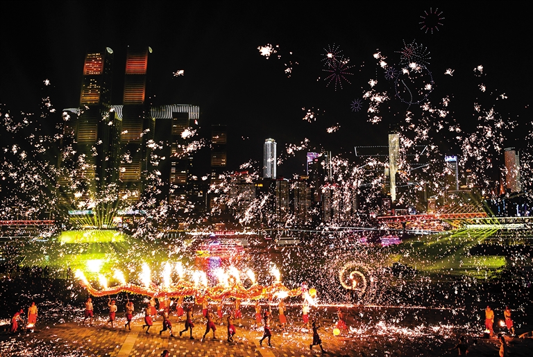 2024重庆“两江四岸”夜景灯饰联动展演多媒体灯光秀及火龙表演精彩上演,为市民和游客带来一场美轮美奂的视觉盛宴。 图为2月9日晚拍摄的2024重庆“两江四岸”夜景灯饰联动展演多媒体灯光秀及火龙表演现场。 新华社记者 王全超 摄