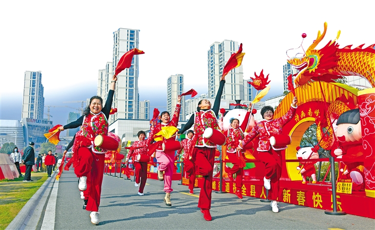 大年初一,人们以各种方式欢度龙年新春,大江南北洋溢着欢乐祥和的节日氛围。 图为2月10日,在浙江省台州市仙居县红旗广场,南峰街道女子腰鼓队为群众表演腰鼓。 新华社发(王华斌 摄)