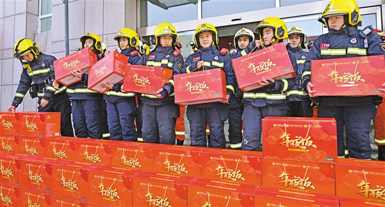 图为2月6日,北京市大兴区消防救援支队的指战员领取慰问品。 新华社记者 陈晔华 摄