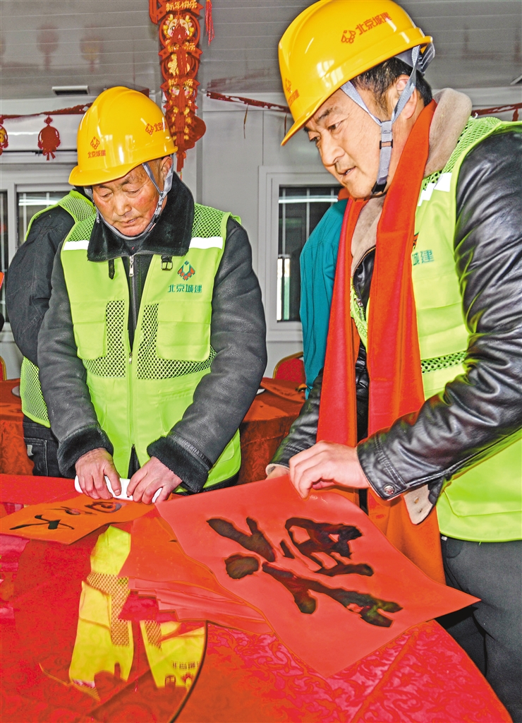 图为2月6日,北京城建集团树村8号地置换集体产业项目(一标段)的工友领取“福”字和对联。 新华社记者 陈晔华 摄