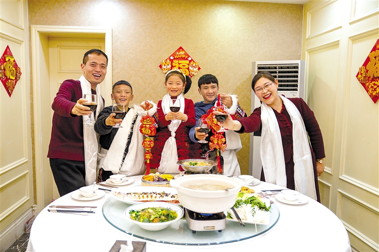 图为2月9日,合肥理工学校西藏班的学生桑杰顿珠(左二)、次巴扎西(右二)和老师万霞(右一)一家贺新春、吃年夜饭。新华社发(阮雪枫 摄)
