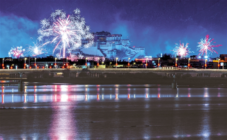 图为除夕夜,绚烂夺目的烟花在拉萨上空绽放。李珩 摄