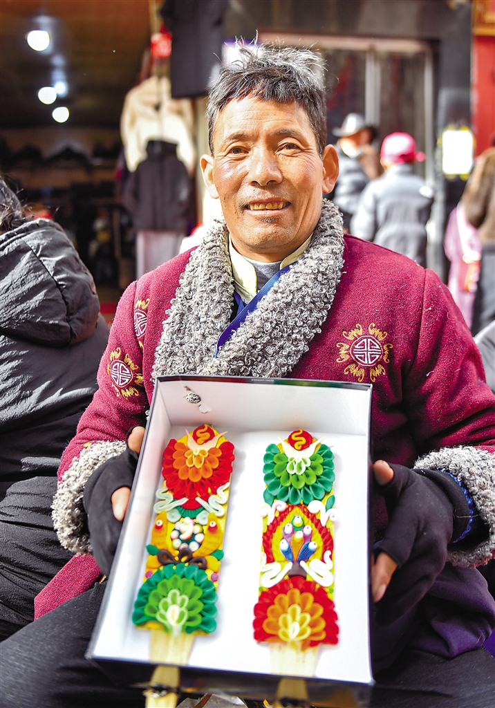 左图:商贩在展示售卖的酥油花。新华社记者 孙瑞博 摄