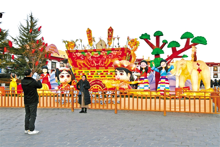 图为拉萨大昭寺广场新年主题装饰前,市民拍照留念。 本报记者 旦增兰泽 摄