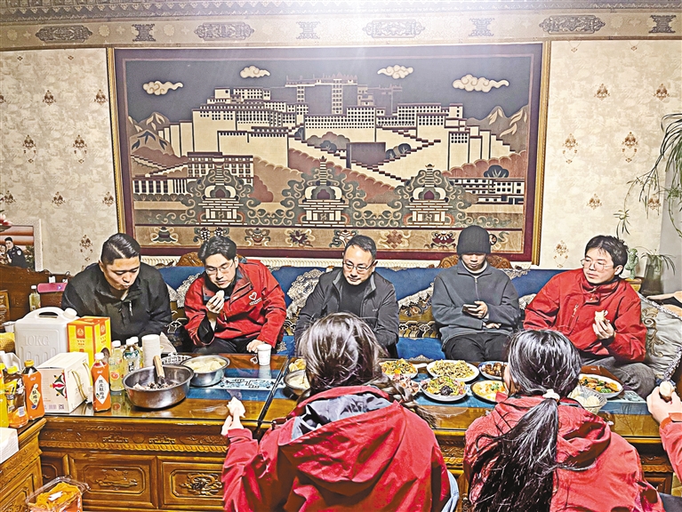 “团年饭”吃到一半时,工作队队员范奎的妻子杨少丽打来了视频电话。视频那头,杨少丽关心着范奎中午吃什么。翻转镜头,一桌子菜、一桌子人。“我们的年过得也很热闹,那曲各级领导都很关心我们,原单位领导同事也给我们送来了新年祝福和问候。你在家放心,不要牵挂我!”