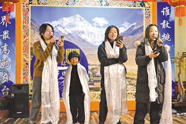 2月9日晚上,珠峰脚下定日县扎西宗乡“侣程驿站”里,来自祖国各地的30多名游客,在这里欢度除夕夜、同吃年夜饭、互道祝福语、共唱吉祥歌,成了一片欢乐的海洋。