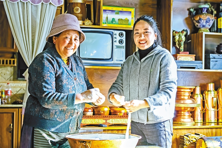 大年夜,“侣程驿站”给游客提供的年夜饭有藏式火锅和“古突”。一张张桌子前,火锅热气腾腾,大家其乐融融。当驿站特意熬制的一大锅“古突”,端出厨房,整个餐厅香味四溢。游客很快拿着碗排成了长队,都想尝一尝这藏家年味美食。