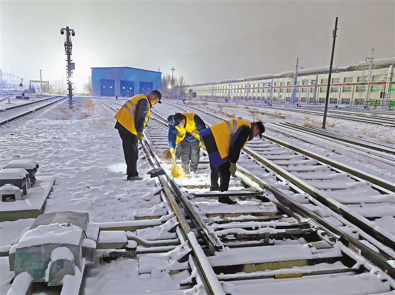 图为职工在清扫车间道岔内的积雪。本报记者 张宇 本报通讯员 魏雪平 摄