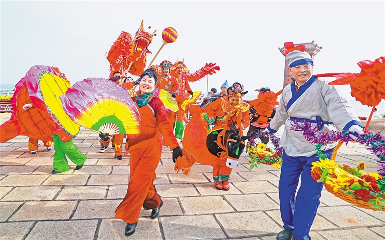 2月4日,在山东省荣成市成山头风景区,民间艺人在进行渔家秧歌、杂耍、舞龙表演。 新华社发(李信君 摄)
