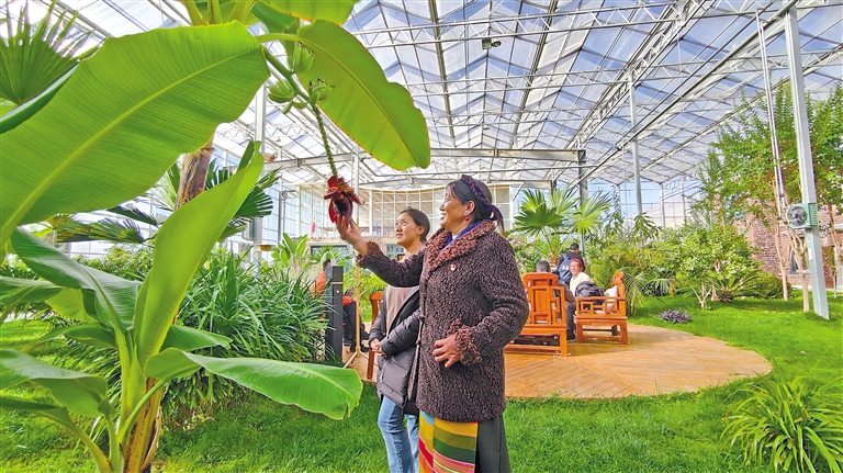 隆冬时节,山南市扎囊县阿扎乡的南方植物展示馆内,一派郁郁葱葱的景象。椰子树、鹤望兰、凌霄花相映成趣。该馆是藏草万亩植物种苗繁育基地的一部分,可为参观游客提供林草科普知识讲解,为学生开设生态课堂进行研学实践等。