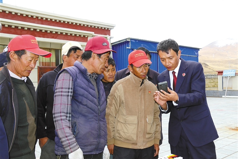 图为浪卡子县人民检察院干警在浪卡子镇道布龙社区开展民事检察法律宣传,向群众讲解检察“两微一端”及微信随手拍小程序的具体操作方法。本报记者 武沛涛 摄