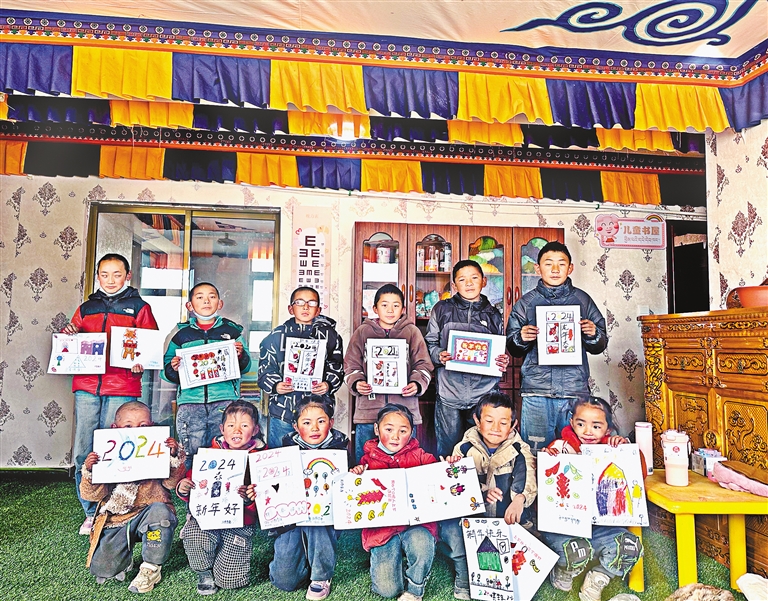 上图:定日县中小学生在“年画知识讲堂”活动中展示年画作品。本报记者 杨子彦 摄