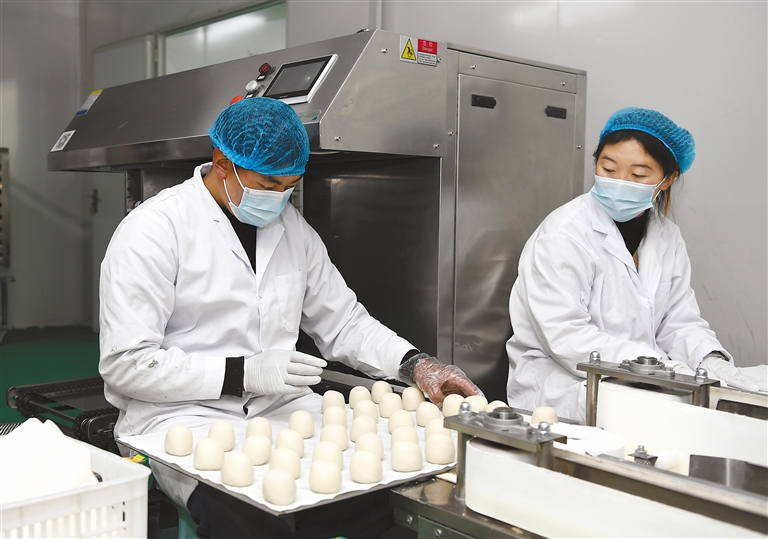 图为昌都市边坝县藏红麦加工厂的工人在生产线上制作食品。本报记者 王敏 摄