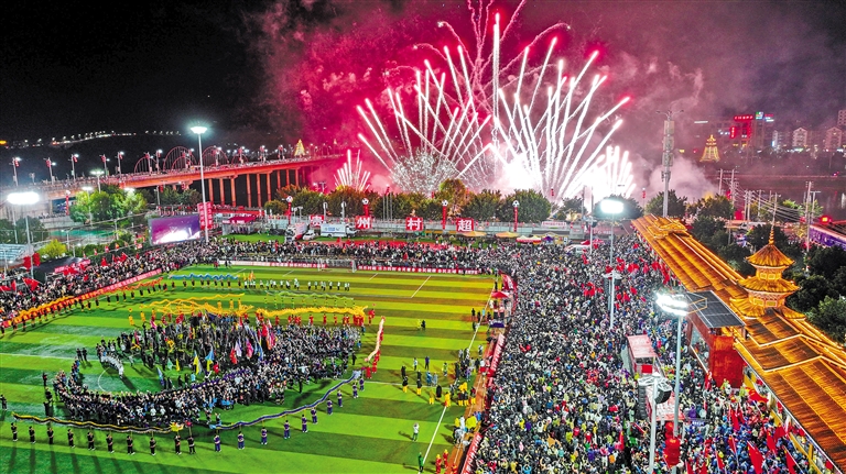 ▲2月3日,2024全国“村晚”示范展示活动暨贵州“村超村晚”在贵州省黔东南苗族侗族自治州榕江县拉开帷幕。这是音乐烟花秀在“村晚”上演(无人机照片)。 新华社记者 刘续 摄
