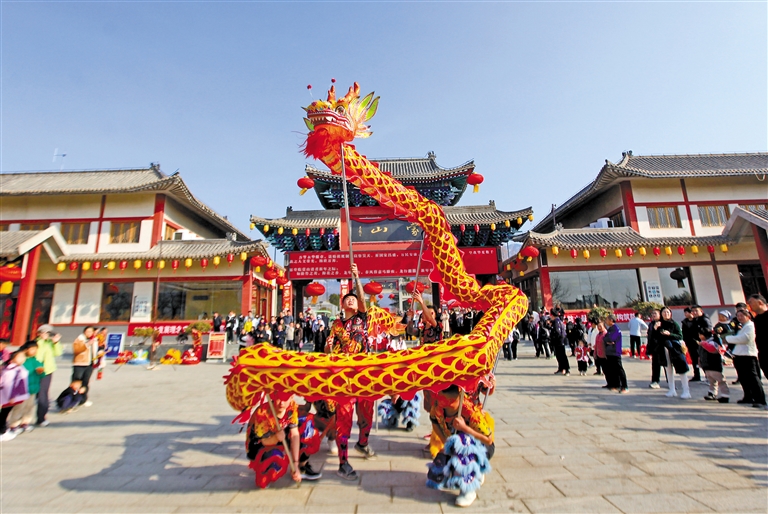 ?2月14日,游客在山东省临沂市平邑县蒙山龟蒙景区新春庙会上观看舞龙表演。