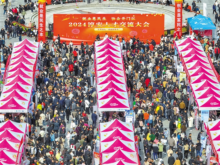 2月18日,浙江省杭州市淳安县千岛湖广场“就业惠民生 协企开门红”大型人才交流会现场人头攒动(无人机照片)。新华社发(毛勇锋 摄)