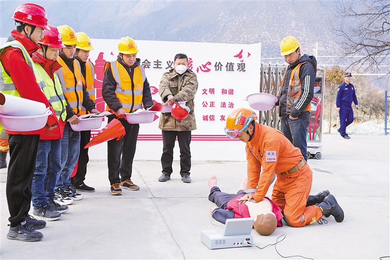 图为林芝市森林消防支队培训队员为中铁职工讲解心肺复苏知识。