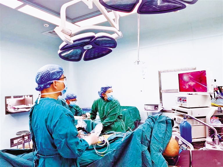 图为中山大学附属第三医院援藏医疗队医生为消化道穿孔患者进行腹腔镜穿孔修补微创手术。本报记者 贡秋曲措 本报通讯员 梁侠 摄
