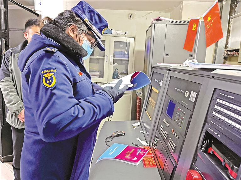 图为防火监督人员在日喀则市乔木郎宗大酒店消防控制室检查防火巡查记录及人员在岗情况。