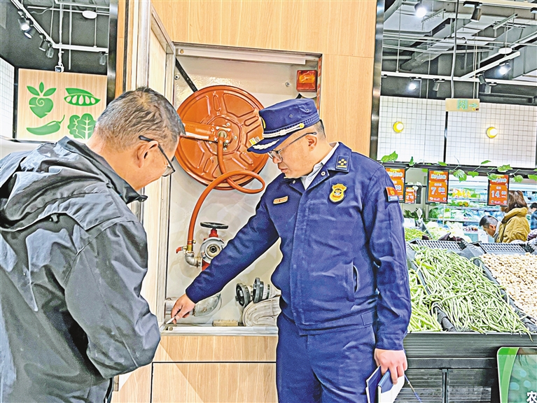 图为防火监督人员在日喀则市互惠互利超市检查消防设施器材。本报记者 扎西顿珠 本报通讯员 仁增群培 摄
