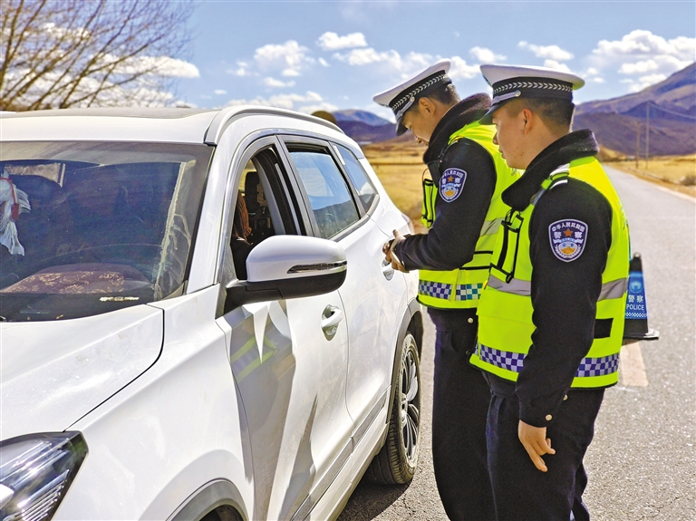 图为交警在检查车辆驾驶人相关证件。本报记者 贡秋曲措 本报通讯员 朗加卓玛 摄