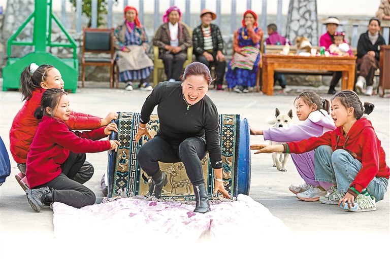 春节、藏历新年长假期间,察隅县下察隅镇塔玛村举办赛跑、歌舞、滚大桶等文娱活动,受到村民热烈欢迎。图为滚大桶活动现场。